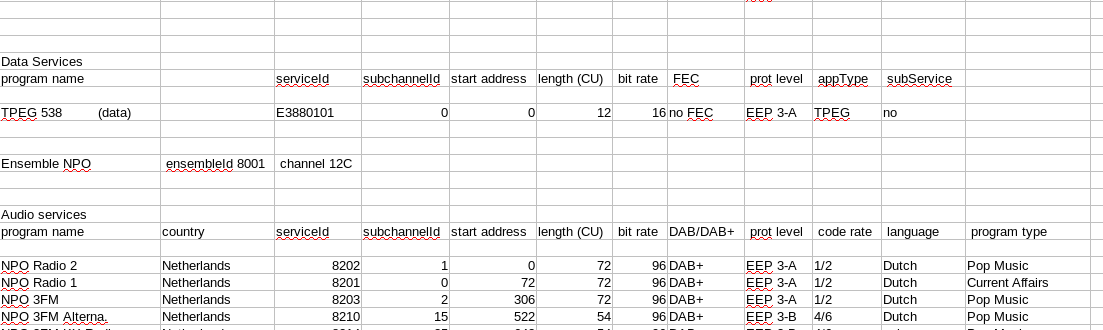 Next to these examples, a simple dab-scanner was made, an example program that just scans all channels of the given band (BAND III by default) and collects and emits data about the ensembles and services encountered. Output can be sent to a file - ASCII - that can be interpreted by Libre Office Calc or similar programs.