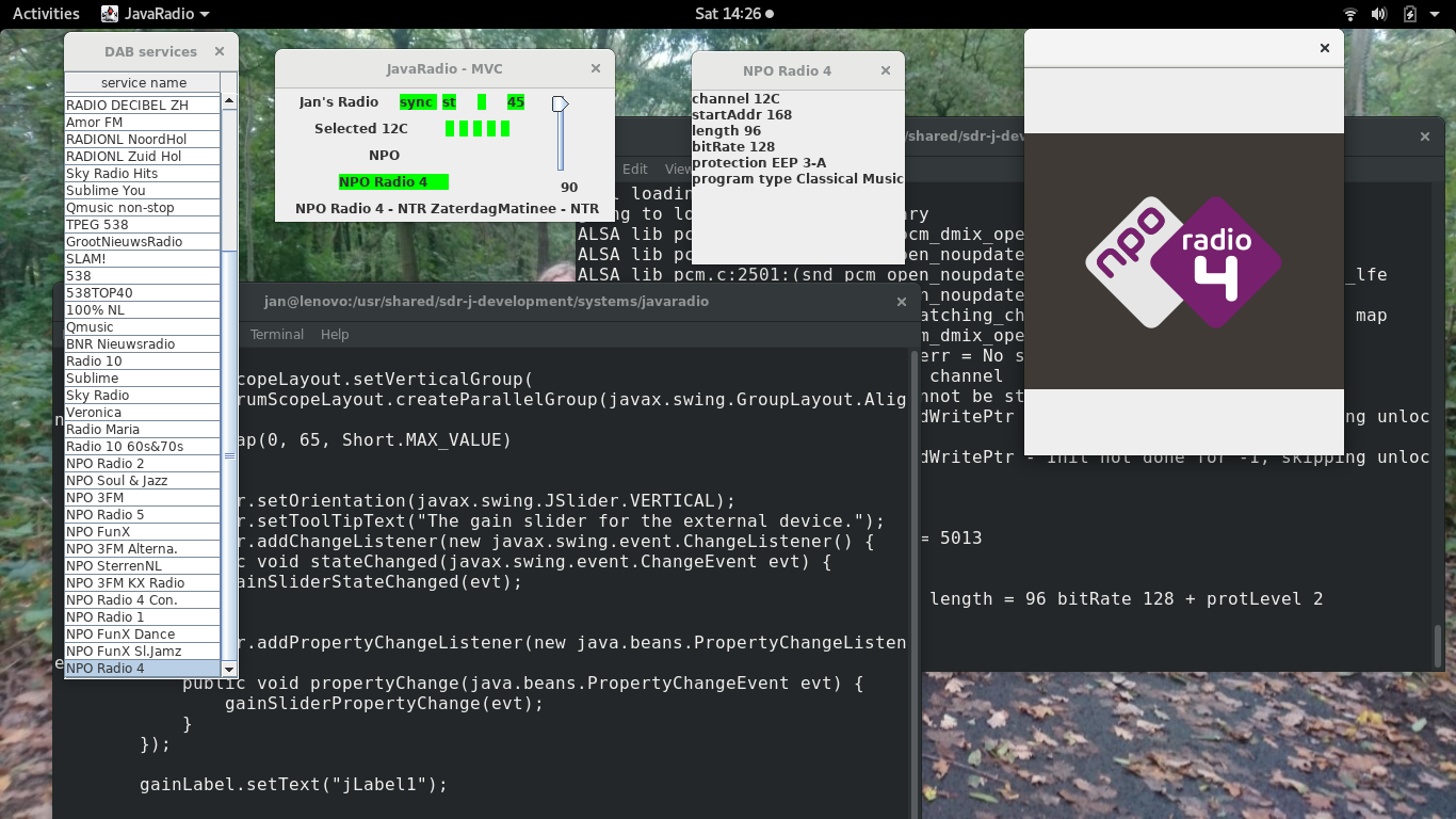 javaRadio is an implementation of the DAB software in java. The advantage of Java is its portability, its main disadvantage is that it runs on a VM and needs some "native" code libraries for e.g. device handling. The javaRadio software is modelled after, and derived from the C++ software in Qt-DAB and dab-cmdline. While it is work in progress, the implementation does work.